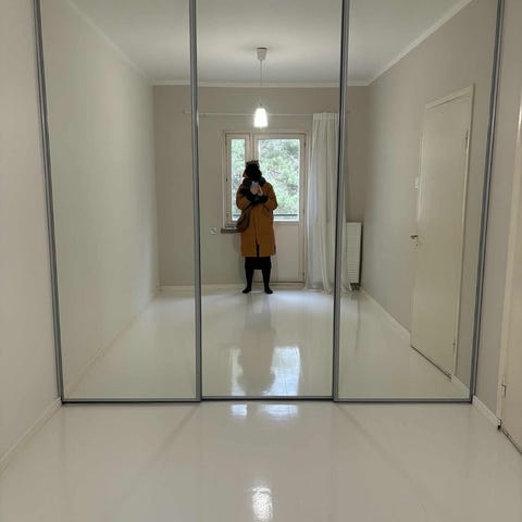 Peiliovellinen vaatekaappi valkoisella sivuseinällä. Kaapissa on tummennetut peiliovet ja ylävalaistus. Kaapissa ei ole takaseinää, toista sivuseinää eikä lattiaa, joten se on helppo koota esim. eteisen nurkkaan. Peiliovien korkeus kiskoineen, ilman ylälistaa 230 cm, valaisinlistan kanssa 235 cm