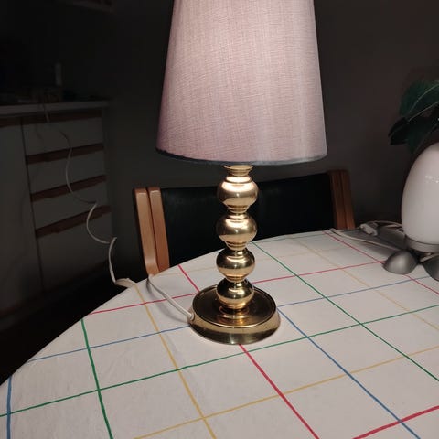 Myyntiin valaisin Mäkelän messinkinen pöytävalaisin. Vielä vanhanaikainen pistoke. Ja messinki kaipaa kiillotusta jos tykkää oikke kullan väristä. Eli aika hyvin tummunut, mukaan tulee myös tuo varjostimen pidike. Korkeus 42,5cm. Hinta 40€ löytyy Salosta MMM