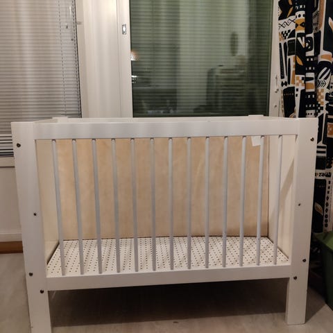 Muurame Milla pinnasänky. Pohjan saa kahteen eri korkeuteen. Kuvien mukaisessa kunnossa. Reunassa muutama jälki. Taloudessa ei eläimiä. Patja kuuluu kauppaan.