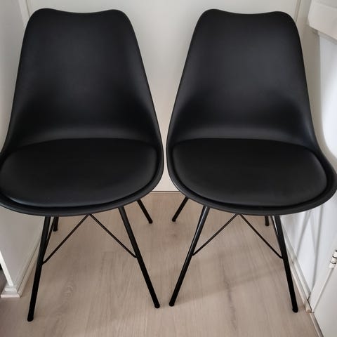 Siisti, hyväkuntoinen ja tyylikäs ruokapöydän tuoli. Väri musta, istuinosassa pehmuste. Istumakorkeus noin 50 cm. Jyskin hinta 59,90€.