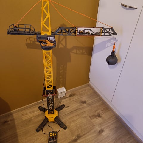 Toimiva nostokurki seuraavalle leikkijälle. Pyörii ympäri ja nousee sekä laskee johdollisella kauko-ohjaimella. Yhdestä jalasta puuttuu muovinappula, mutta ei vaikuta toimintaan. Vähän pientä korjausta tehty muutenkin, mutta ei ainakaan alkuperäistä huonompi ole.