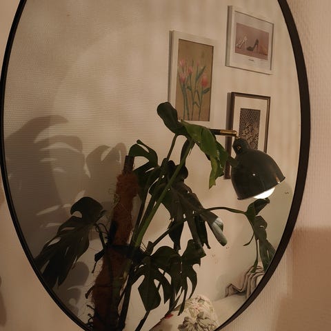 Kiva pyöreä peili, jossa on valkoinen kehys. Kehys metallia ja takana ripustuskoukku. Laadukkaan tuntuinen. Halkaisija 50 cm. Voi tulla noutamaan Turusta Kirstinpuistosta.