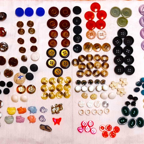 Monipuolinen nappikokoelma eri väreissä ja materiaaleissa