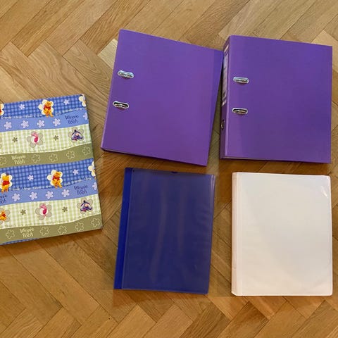 Sininen A4-kokoinen kansio, jossa on metallinen rengasmekanismi. Käytetään paperien ja asiakirjojen järjestämiseen.