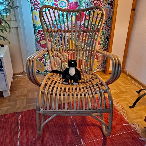 Kaunis, uudenveroinen rottinkituoli, jossa valkoinen pehmuste, Parolan rottinki.