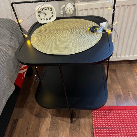 Jyskistä ostettu NYBO sivupöytä. Suurempi malli, eli halkaisija 55cm. Ei käytönjälkiä. Pöydästä saa purettua jalat pois.