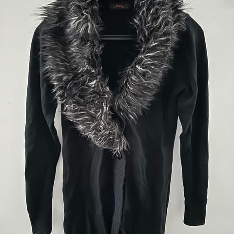 Myydään siisti tummanharmaa pörrökauluksinen neuletakki. Kaulus napeilla kiinni ja irrotettavissa.