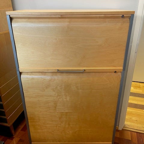 Annetaan Iskun toimistokaappi. Lukolliset alakaapit, toinen kaapinovi osittain irti saranoiltaan.
