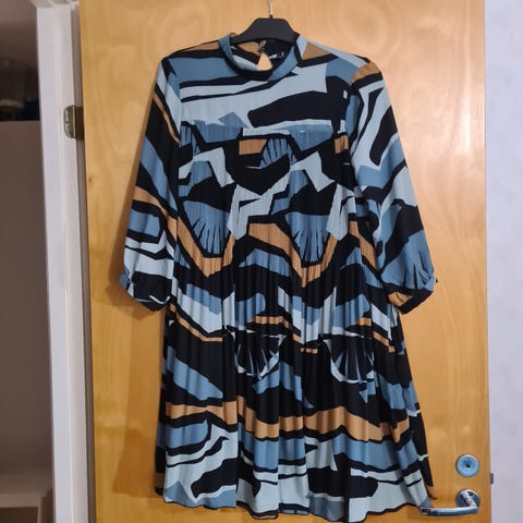 Mustavalkoinen kuviollinen pliseerattu mekko, jossa hihansuissa ja kauluksessa röyhelöt. Takana kauluksessa nappi. Polvipituinen mekko, jossa kiinteä alusmekko.