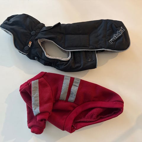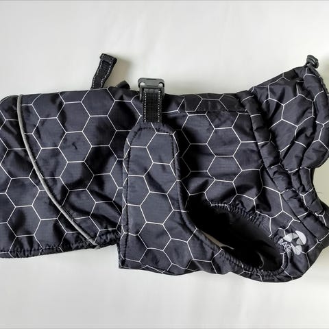 Minni päätti että hän on jo iso tyttö ja pentuvaatteet joutaa seuraavalle pennulle, tai pienemmän rodun edustajalle. Tästä siis lämmin talvivaatetus vielä näille pakkasille. Kylmimpään aikaan fleece alle ja toppatakki alle. Toppatakki vedenpitävä ja lämmin toppaus ympäriinsä. Hyvät säätömahdollisuudet. Takki kokoa 25, fleece samaa kokoluokkaa .