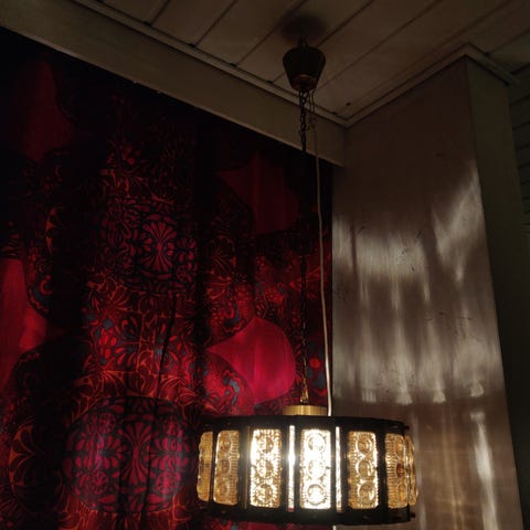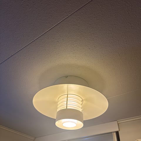 Alkuperäisillä kettingeillä ja johdoilla oleva design kattovalaisin kohtuullisella hinnalla tarjolla. Alareunan pyöreästä lasilevystä puuttuu paloja reunoilta. Muuten kunto hyvä. Toimivana irrotettu.