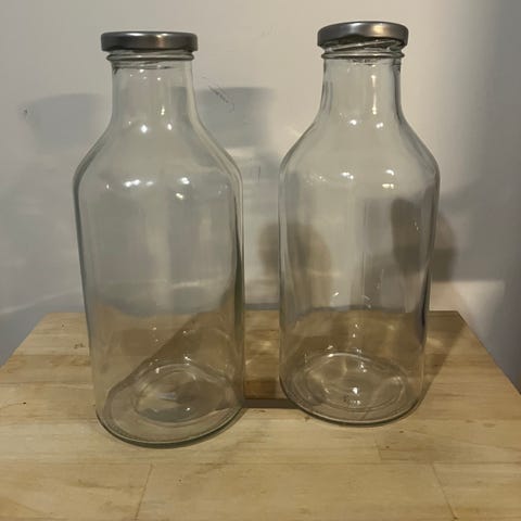 Lasinen pullo, jossa metallinen ilmatiivis suljin. Kirkas lasimateriaali. Tilavuus noin 1,5 litraa.