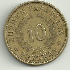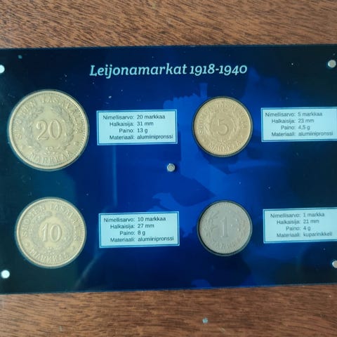 Suomi 1 Markka -kolikko vuodelta 1923 Hevosmarkka rahakehyksessä. Kolikko on valmistettu metallista ja esittää Suomen vaakunan kuvion. Kolikon koko ja väri ovat perinteiset, ja se on tarkoitettu keräilyyn tai numismaattiseen käyttöön. Rahakehyksestä näköjään heijastuksia. hinta 15 e posti 2.50 e
