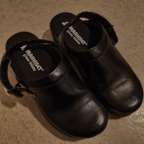 Hyväkuntoiset työkengät esim.keittiössä työskentelyyn. Tarroilla säädettävä päälinen.Mukaan käyttämättömät pohjalliset !