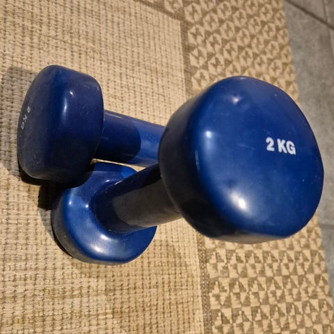 Käsipainot, paino 2 kg, valmistettu muovista.