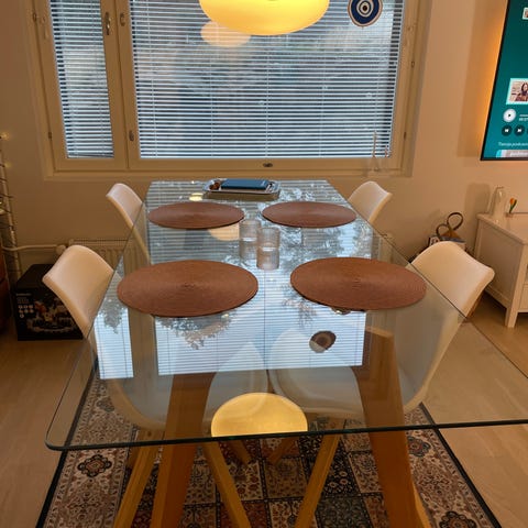 Hakusanat: huonekalu, huonekalut, puujalat, lasilevy, käytetyt huonekalut, pöytä, 180x90cm, pöydät, lasipöytä, ruokapöytä, keittiö, keittiöpöytä, ruoka, moderni, ruokailu, taso, keittiön