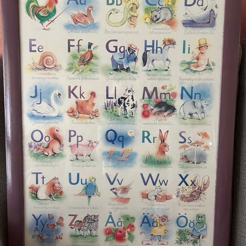 Myydään aakkostaulu kehyksineen. Kehykset mustat Clas Ohlsonilta. Kehysten ulkomitat 51*71.