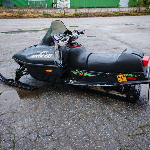 Arctic Cat Puma moottorikelkka violetti-vihreällä värityksellä. Varustettu mittaristolla, työkalusarjalla ja istuimella kahdelle. Sopii talvikäyttöön lumisissa olosuhteissa.