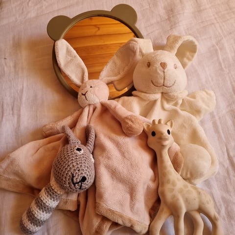 Nijntje Miffy pupuaiheinen vauvan lelusetti. Helistin ja iso pupu helisevät. Ihana pehmeä, hän käytetty setti joko tyttö- tai poikavauvalle. Väri neutraali siniharmaa.