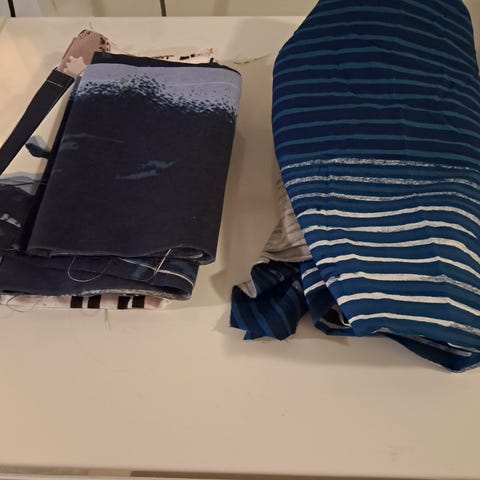 N. 100 cm x 135 cm peitoksi ommeltu lakanakangas, toinen puoli kokonaan näkyvissä olevaa sinisävyistä kangasta. Toinen puoli enimmäkseen vaaleanpunapohjaista kangasta.