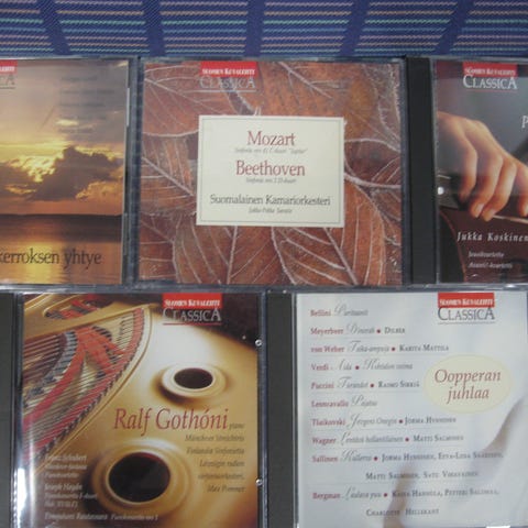 Myydään klassisenmusiikin cd-levyjä 2,00 euroa kappale. Kaikki cd:t kuunneltu ja todettu toimiviksi. Cd:ssä voi olla naarmuja & kansipapereissa jälkiä/omistuskirjoituksia, mutta cd-kotelot ovat ehjät. Postituskulut ostajalle ja noutokin sovittavissa.