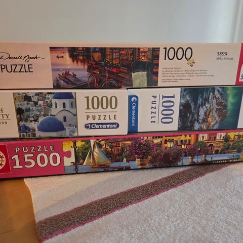 Myydään kuvien mukaiset kerran kasatut 1000 palan palapelit ja muovikääreissä oleva kasaamaton 1500 palan palapeli. Tuhannen palan palapelit 5 euroa/kpl, 1500-palainen 8 euroa. Pionit ja ruusut -palapelistä puuttuu yksi pala, sen saa kaupan päällisiksi.