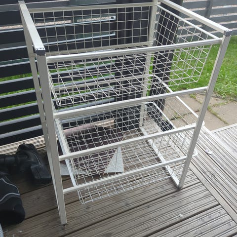Myydään suoraan käytöstä keittiölokerikko. Voidaan asentaa esim kaapin alle toisinpäin siksi reijät pohjassa, meillä ollut tason päällä kuten kuvassa. Hieman kahvin väriä yhden lokerikon sisäpuolella ja yksi kahva ottanut osumaa, siitä palanen pois mutta ei ole terävä. Vain nouto Herukka Oulu. Koko leveys 60cm, Syvyys 16cm, korkeus 15cm.