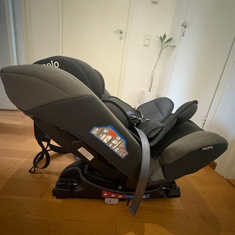Lionelo turvaistuin. Käytössä noin kaksi-kolme vuotta. Istuin kääntyy, jolloin lapsen nostaminen istuimeen helpottuu. Istuimella matkustus kasvot meno- ja paluusuuntaan.
