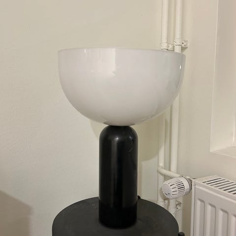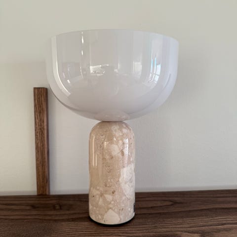 Siisti, toimiva pöytävalaisin (johdolla). Valkoinen marmori jalka. Jalan korkeus: 21cm, kupu korkeus 13cm, leveys 25cm