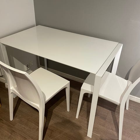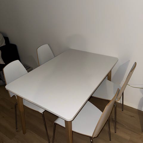 Ihan hyvässä kunnossa oleva ruokailuryhmä. Pöytä on kuvissa "pidennetyssä" muodossa. Neljä tuolia yhteensä.