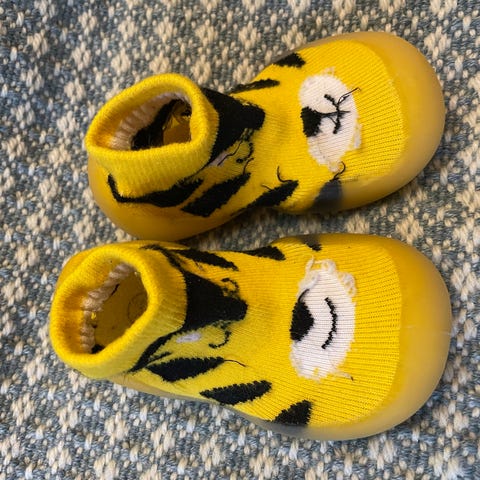 Komuellon prinssi (Crown prince) sukkakengät. Kokomerkintä 6/22,5/125mm, valmistajan mukaan 1-1,5 vuotiaalle. Tosi vähän ehditty pitämään, siistikuntoiset. Oikean kengän kankaassa huomattu pieni tummentuma jota hankala saada kuvaan, ei ole yritetty poistaa.