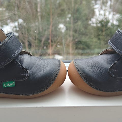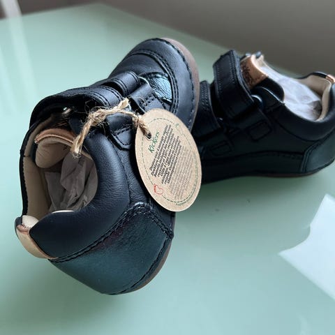 Vähän pidetyt Kickers Sabio ensikengät. Koko 21, väri tummansininen. Hieman hiekka/pintalikaa, kärjissä aavistus haalistumaa. Tarrat pitää hyvin. Kengän sisäosassa ollut nimikointi joka yliviivattu. Mukaan alkuperäinen pakkaus.