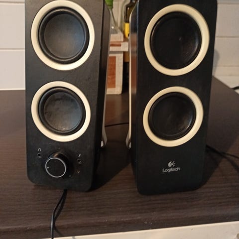 Logitech kaiuttimet, joissa USB- ja kuulokeliitäntä. Sopivat mm. tietokonekäyttöön.