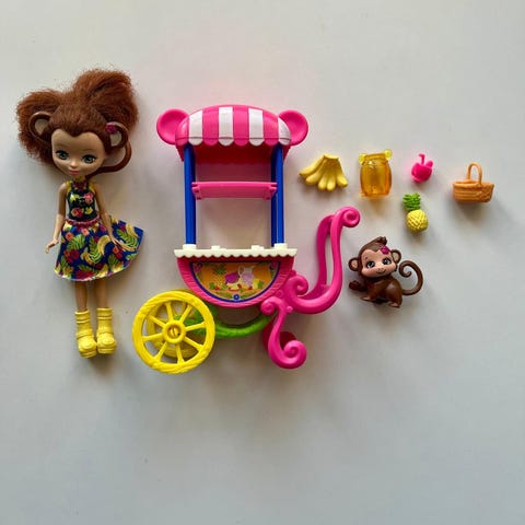 Enchantimals Merit monkey apinasetti, kuvassa näkyvät tavarat.