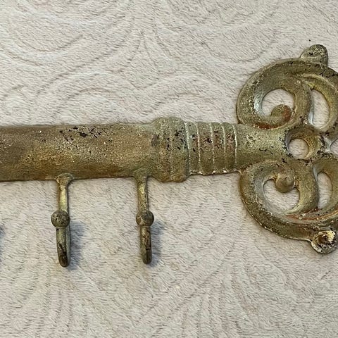 Vanha pitkä puinen tappinaulakko hattuhyllyllä. Pituus 138cm ja korkeus noin 24cm.
