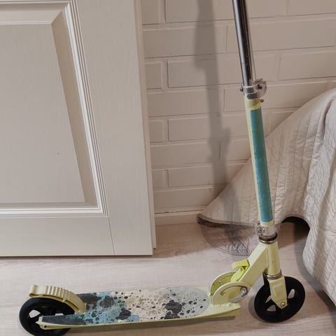 Varaston perälle jäänyt potkulauta. Tuntuisi rullaavan ja olevan ihan jämäkkä kampe. On vähän ajan ja käytön tuomaa jälkeä.
