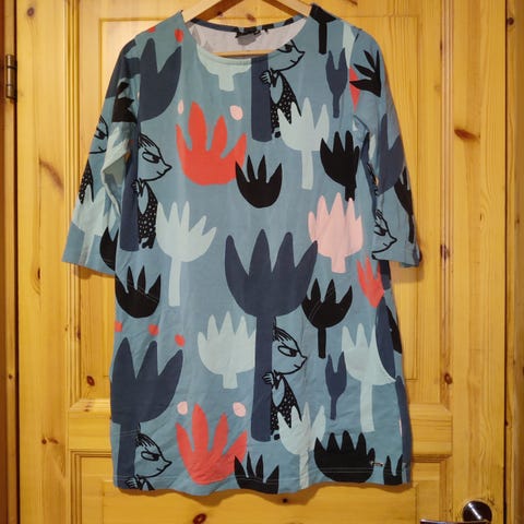 Myydään värikäs Muumi-tunika, koko s, sivutaskut, 3/4 hihat.