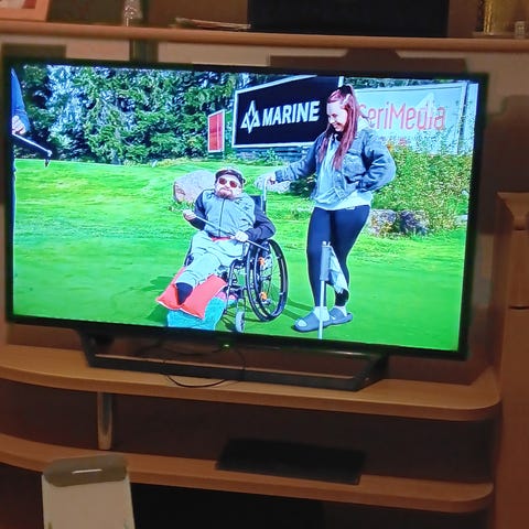 TV kuuluu kaksi johtoa sekä kaukosäädin.