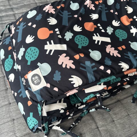 Mielettömäm söpö isoäidinneliöistä tehty reunapehmuste pinnasänkyyn, näitä 2 kpl. Yhden reunuksen korkeus 27,5cm ja pituus 190cm +narut. Meillä ollut 120cmx70cm sängyssä. Päädyttiin nukkumaan perhepedissä, joten pehmusteet on jääneet vain pölyttymään pinnasänkyyn.