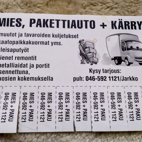Voisin auttaa kaappien,kodinkoneiden, pienten sohvien,sänkyjen, nojatuolien, pöytien yms. hakemisessa ja/tai viemisessä. Myös sorttiasemalle voin viedä tavaraa/roskaa,siinä hinta on sorttimaksu ja erikseen sovittu pieni korvaus avusta. Pakettiauto (sisämitat pituus-240cm,leveys-130cm,kork.-140cm) ja kuski,autan kantamisessa, ja yksi ihminen mahtuu myös autoon mukaan tarvittaessa. Voin nyt lumien tultua tulla myös tekemään lumitöitä,itselläni on lumilapio ja kola, eli käsipelillä onnistuu,ja hoidan kyllä isommatkin lumityöt,jos esim takapiha tarvitsee puhdistaa lumesta. Kysy rohkeasti, niin katsotaan miten voin auttaa! Asun itse vantaalla,ja liikun kyllä vähän pidemmällekin tarvittaessa. Hinta sovitaan tapauskohtaisesti, Kuitenkin aina hyvä, edullinen ja molemmille sopiva hinta. Teen tätä omien töiden ohessa, auttamisen ilosta ja pienestä korvauksesta, eli ei ole mikään kuljetusliike. Laita viestiä niin katsotaan miten voin auttaa!