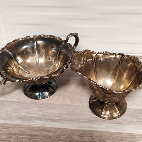 Vanha kermakko , sokerikko ja ovaalinmuotoinen aluslautanen kotimaista uushopeaa.