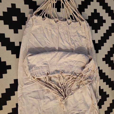 Hyväkuntoinen riippumatto paksua kudottua kangasta.