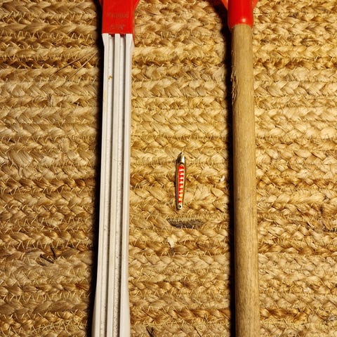 Keskimmäiseen on teipattu tukevasti uusi puukahva. Myynnissä myös vanha pilkki ja joitain vieheitä, katso muut ilmoitukset.