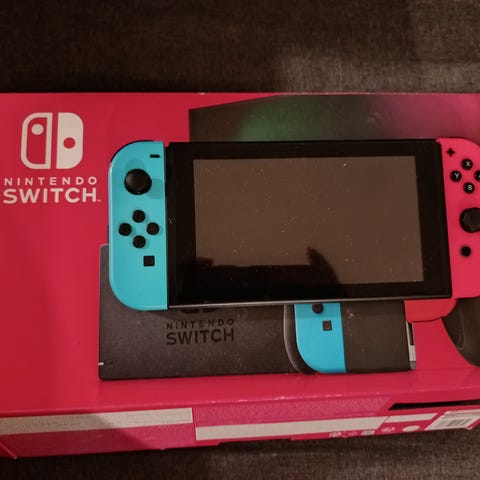 Nintendo Switch pelikonsoli sisältäen Neon Red ja Neon Blue Joy-Con -ohjaimet. Mukana telakka, ohjainten kiinnikkeet, virtajohto, säilytysboxi ja New Super Mario Bros . U Deluxe -peli.
