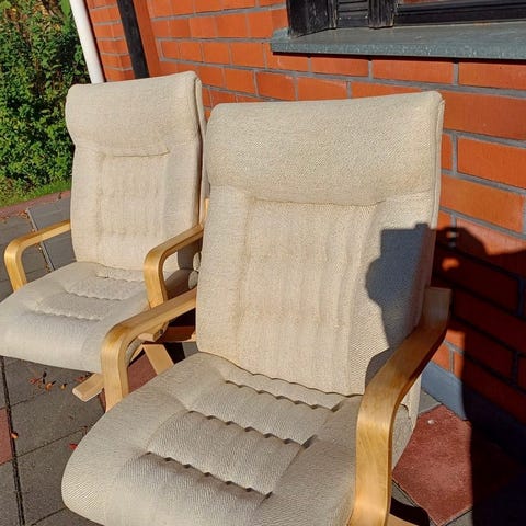 Harmaa kankainen nojatuoli. Elämisen jälkiä, kissatalous niin jokunen karvakin löytynee. Leveys/syvyys mitattu istuinosasta, korkeus selkänojasta lattiaan. Tyyny erillinen, ei kiinni nojatuolissa.