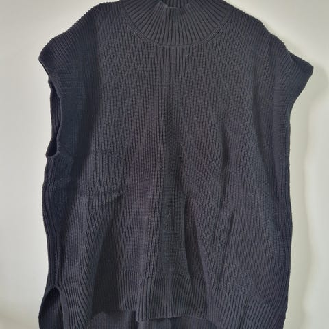 Tummansininen reikäneuleliivi, sivuilla hapsut, materiaali puuvillaa.