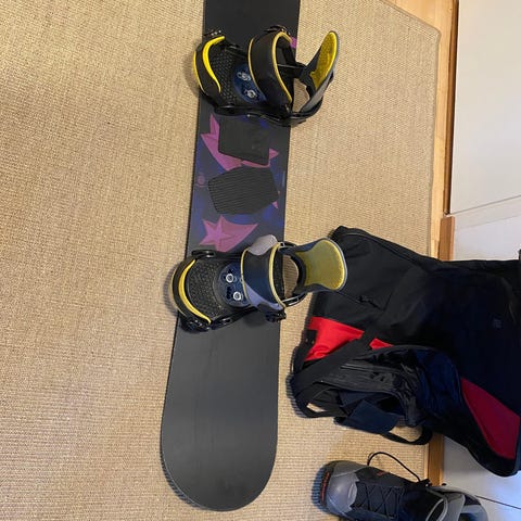Burton ltr 134L lumilauta sekä siteet. Pieni palanen lohjennut laudan päältä, joka paikattu hartsilla. Ei haittaa menoa millään lailla.