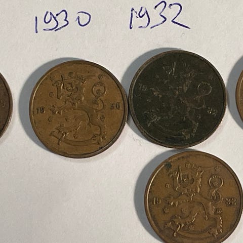 Suomi 5 Pennia kolikot vuosilta 1915 ja 1916. Kolikot ovat valmistettu kuparista. Sopivat keräilyyn tai numismaattiseen käyttöön.