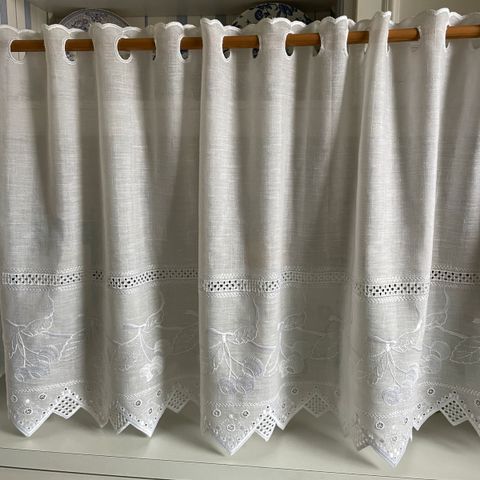 Kappoja on kaksi, yhden hinta 10 euroa. Lev 105, kork 95. Korkeuttta voi säätää nauhoilla. Alareunassa kuja johon voi halutessaan laittaa riman. Nouto tai postikulut
