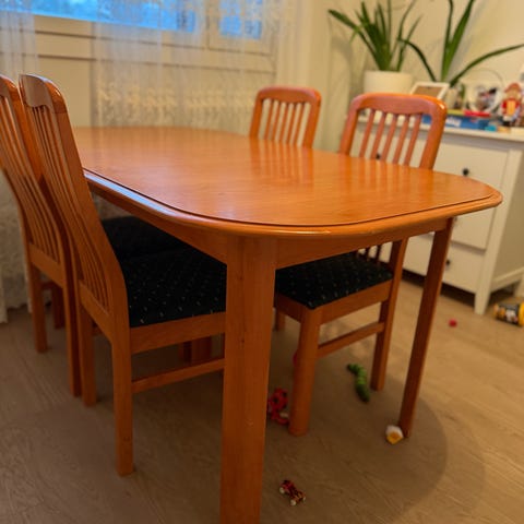 Siistit valkoiset keittiökalusteet,pöytä+4 kangas päällysteistä tuolia.Kahdessa tuolissa alla ruuvien kohdassa halkeamat mutta eivät ole näkyvissä eikä haittaa istumista.